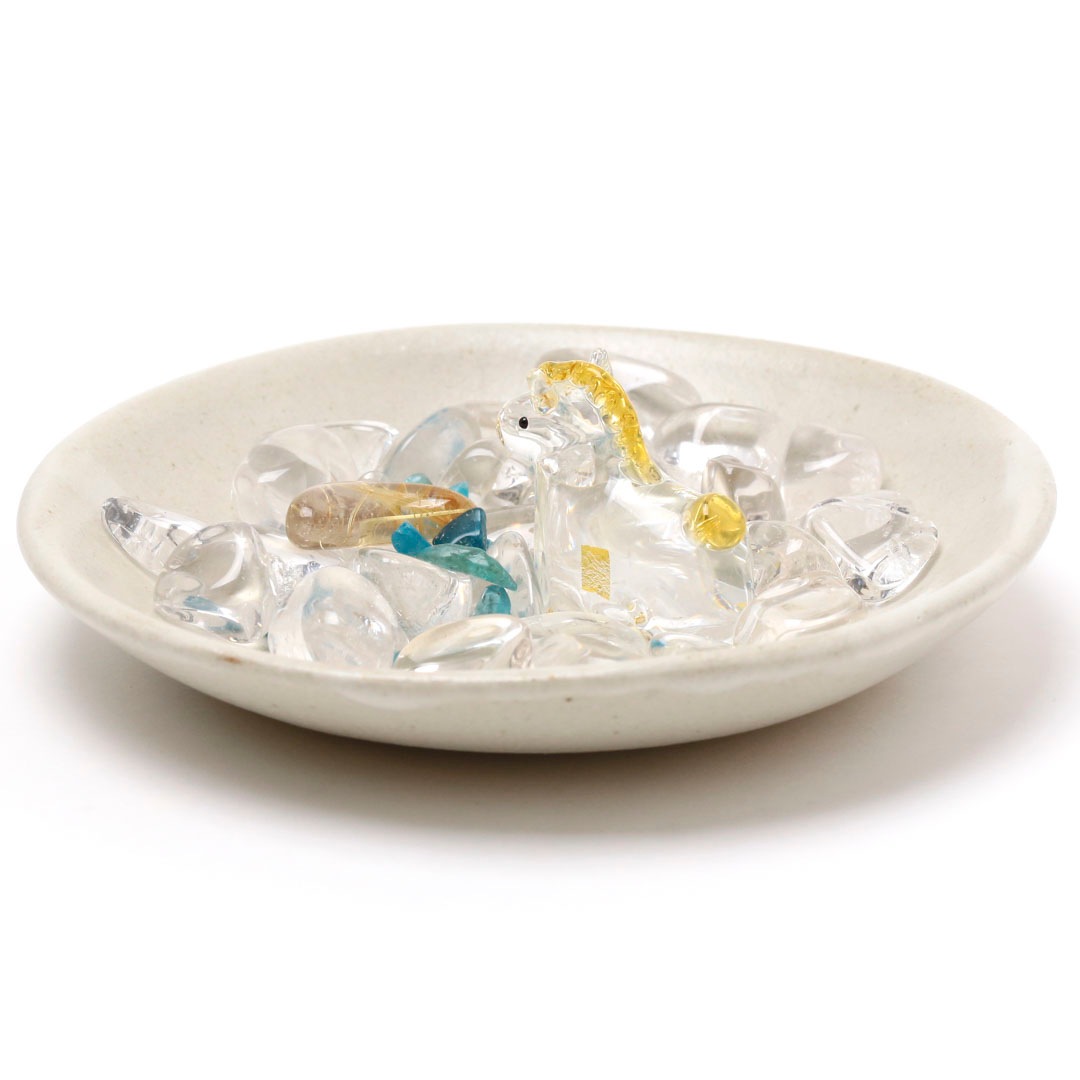 ▼商品内容:御守り石タンブル(ルチルクォーツ) / 干支ガラス(午)金箔入り / 水晶チップ(大粒)約50g / アパタイトチップ 約1.5g-1.7g / 皿:約9.5cm×9.5cm