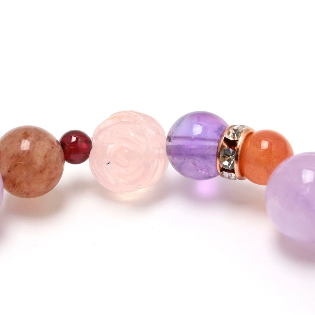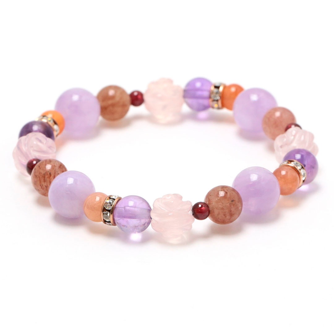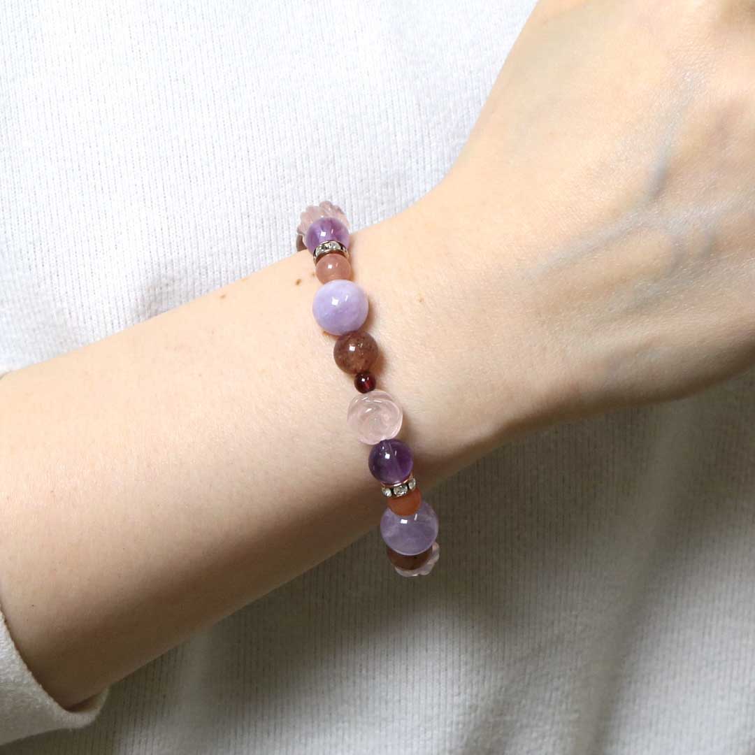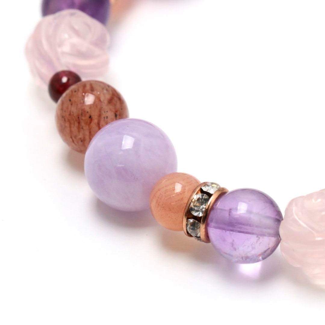 ▼使用されている石:マダガスカルローズクォーツ / ラベンダーアメジスト / ミルキーラベンダーアメジスト / アフリカンストロベリークォーツ / ガーネット / ボツワナカーネリアン