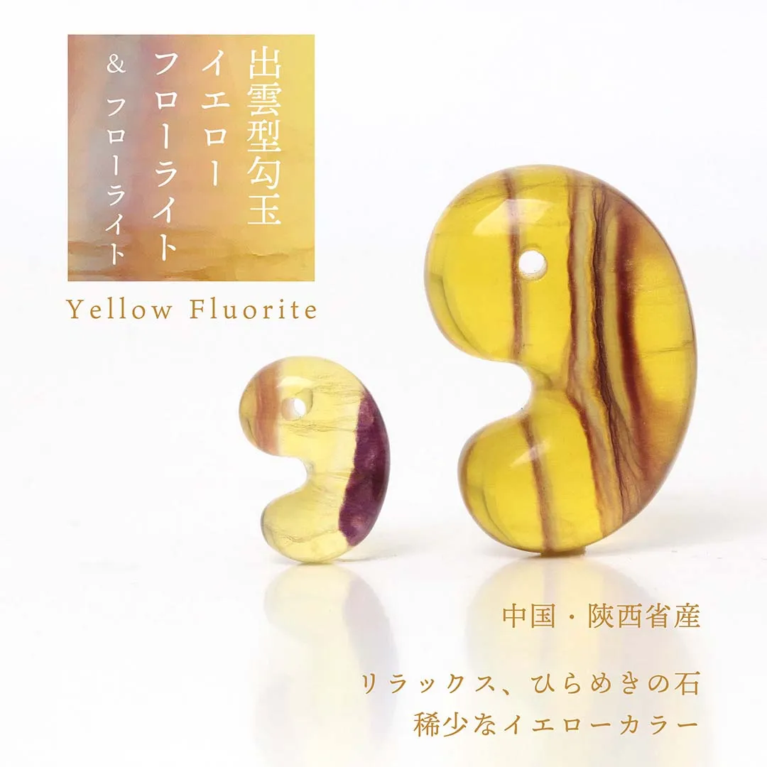 2025年はじめにレインボーカラーのフローライト勾玉を製作した際も、イエローカラーの原石は手に入れることができず、今回はわたしたちにとっても待望のリリースとなりました。