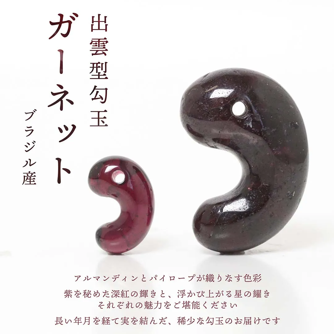 勾玉に加工できるほどのサイズと質を持ったガーネットの多くは、赤黒く透明感に乏しいものが一般的。 今回使用した原石は、透明感と発色のバランスが良く勾玉としての美しさを引き出せる、またとない希少な素材。ぜひご堪能くださいませ。
