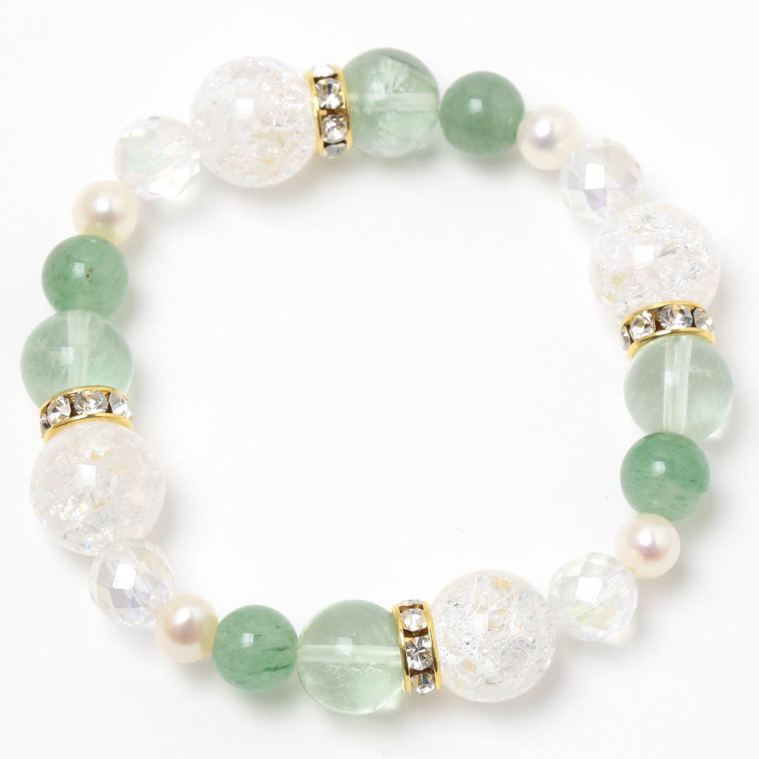 ▼使用されている石:クラッククォーツ / アベンチュリン / グリーンフローライト / 淡水パール / オーロラクォーツ
