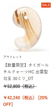 タイガールチルクォーツの勾玉はアウトレット価格 42,240円と表記されておりますが、本来52,800円なので、102,300円になるため、実質51.1%OFFとなるのです。