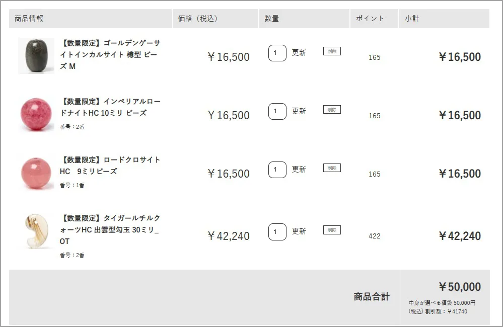 高額商品を1点、おすすめ商品を3点カートに入れるとまとめ買い割引が行われます。