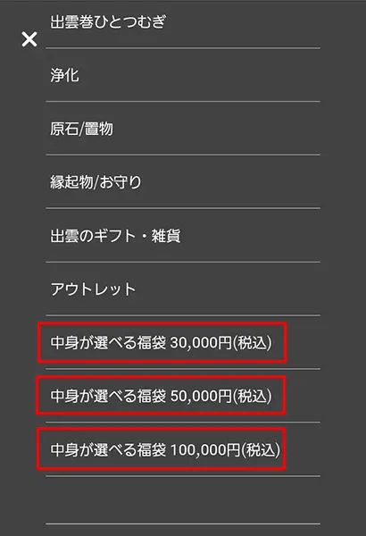 カテゴリ一覧やその他コンテンツが表示されますので、下にスクロールしていくと赤四角で囲った各金額ごとの「中身が選べる福袋」が出てきます。