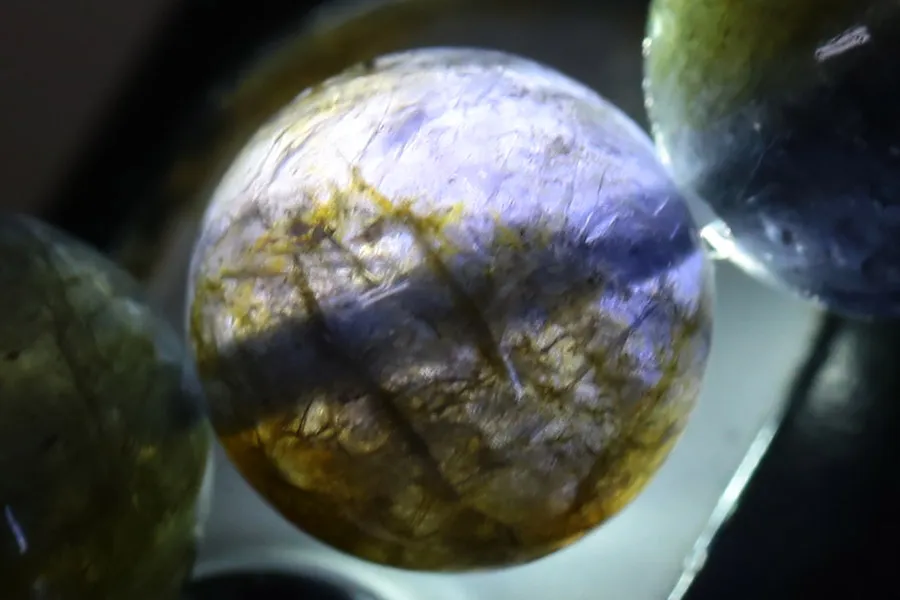 菫色のアイオライトの中にもやもやっとした黒っぽいものが入っているのが見えますよね。