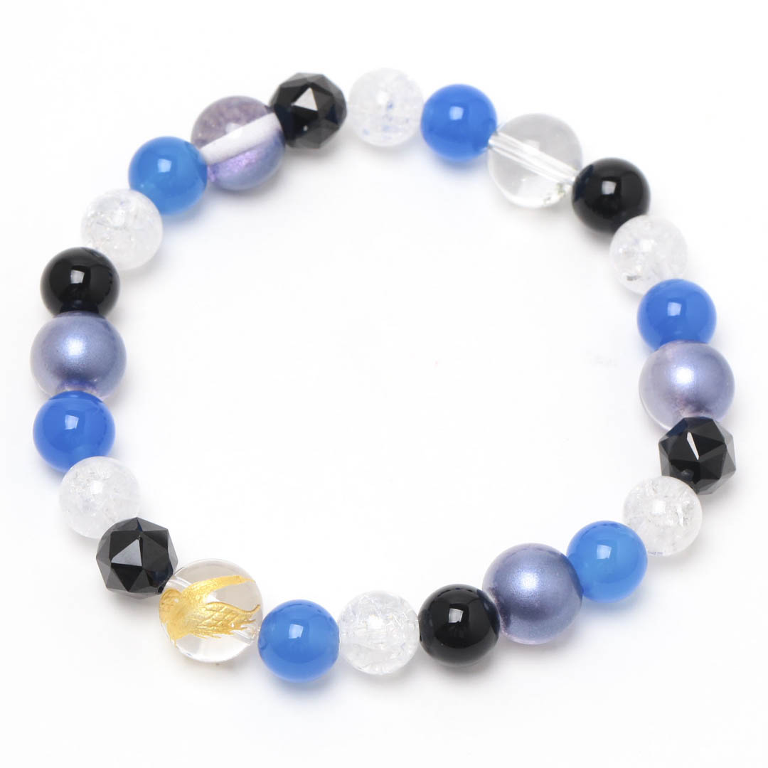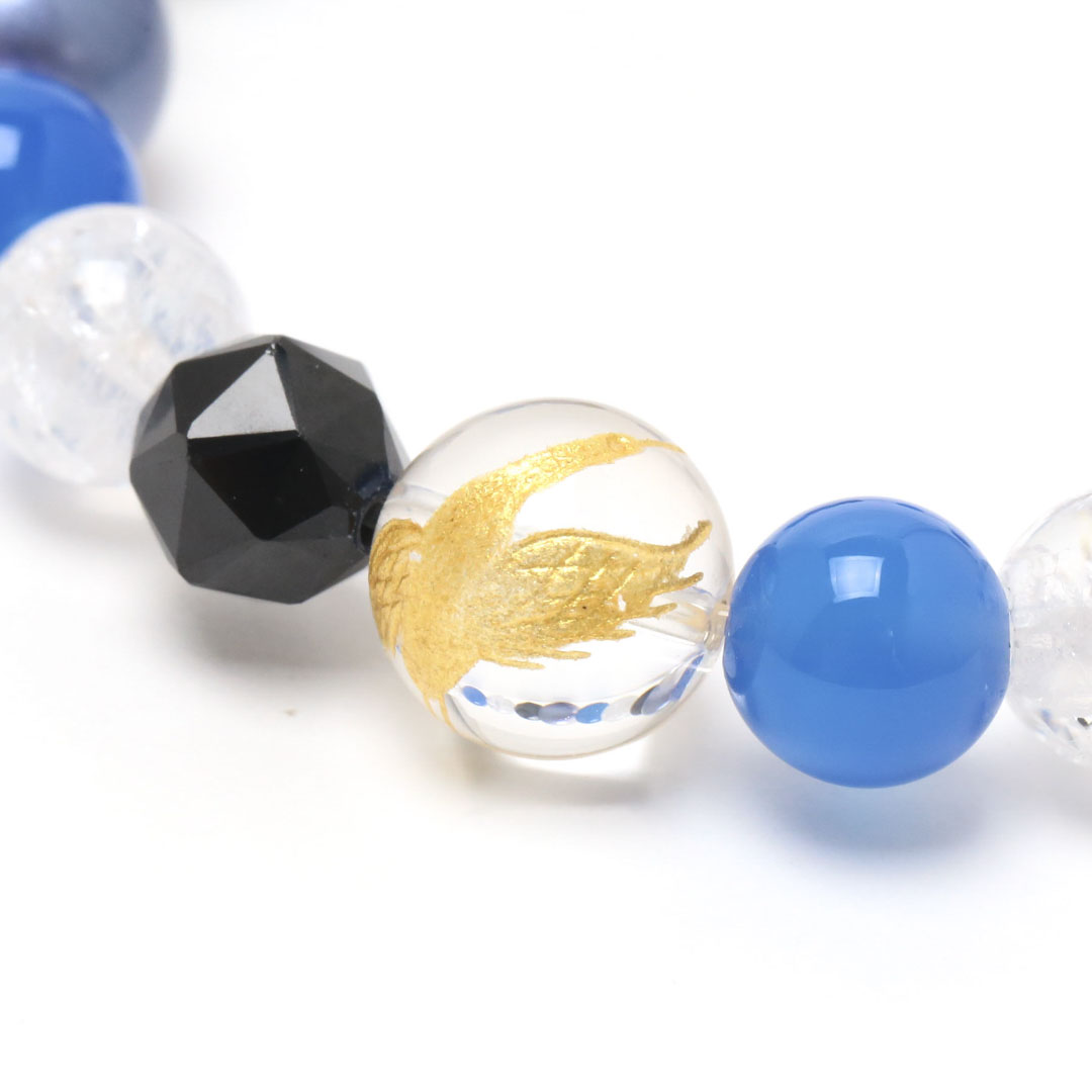 魔除けの意味合いを持つブルーめのうをベースに、長寿や飛躍の象徴として親しまれる鶴ビーズを主役にした1本*