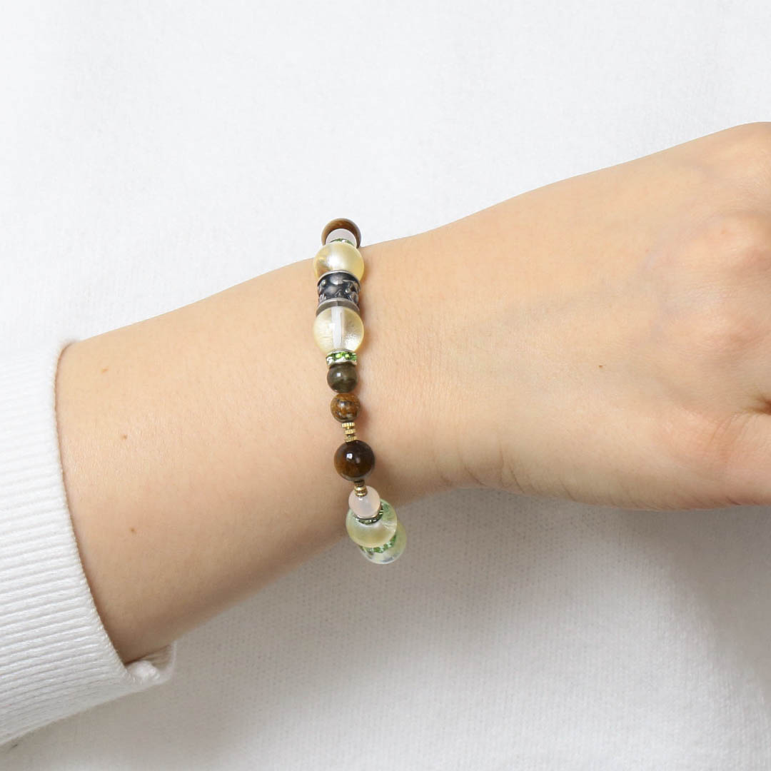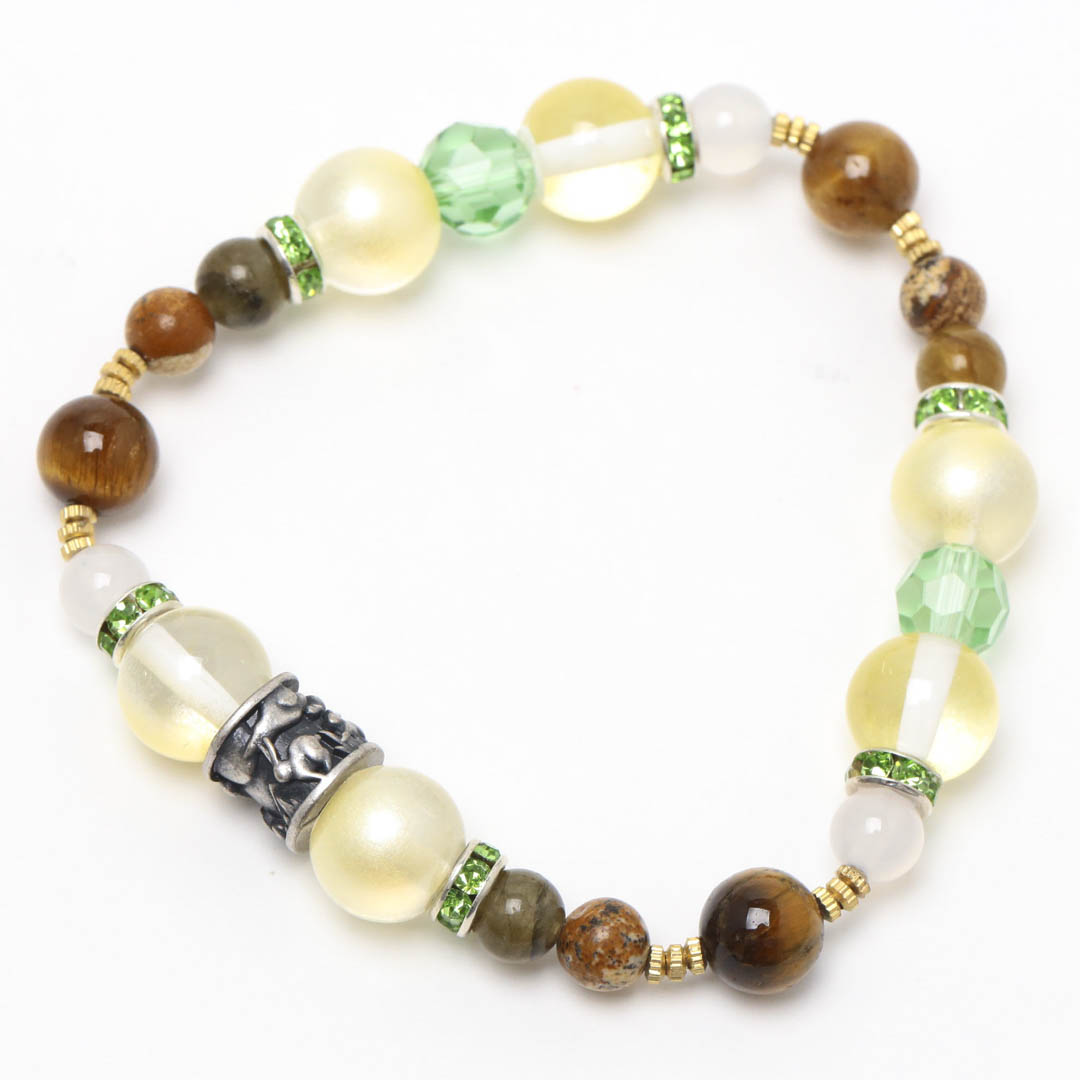タイガーアイとピクチャージャスパーをベースに、やさしいイエローやグリーンを合わせて仕上げたブレスレット。