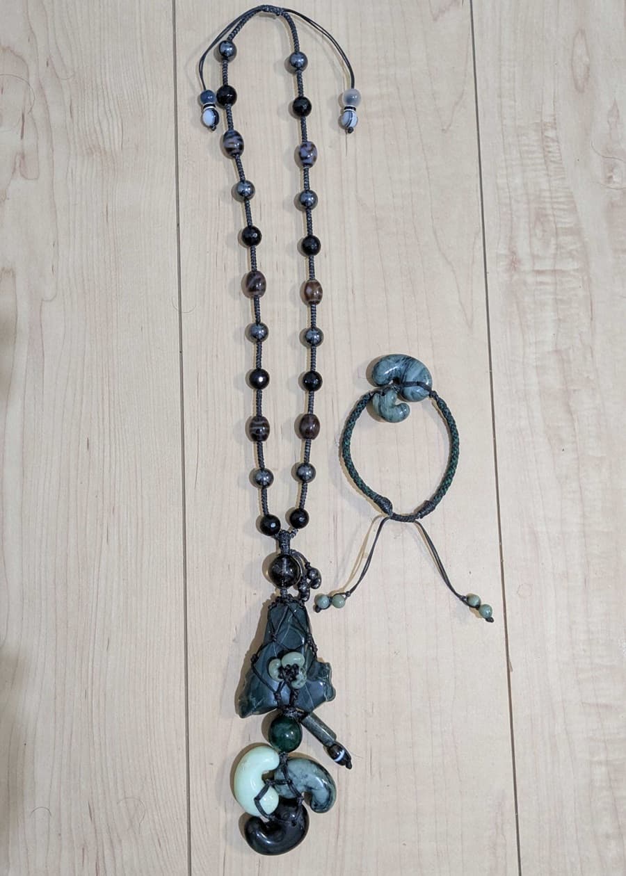 玉人磨きに、「オブシディアン、日高翡翠、クリソプレーズ」を繋げ、