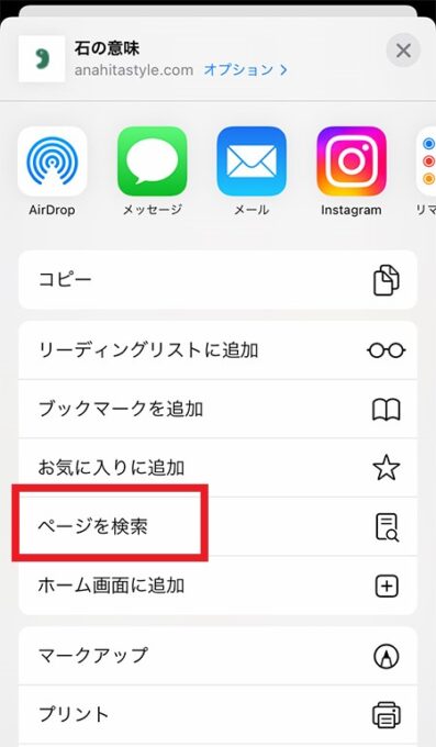 ②表示された画面にある「ページを検索」をタップ(下画像の□)