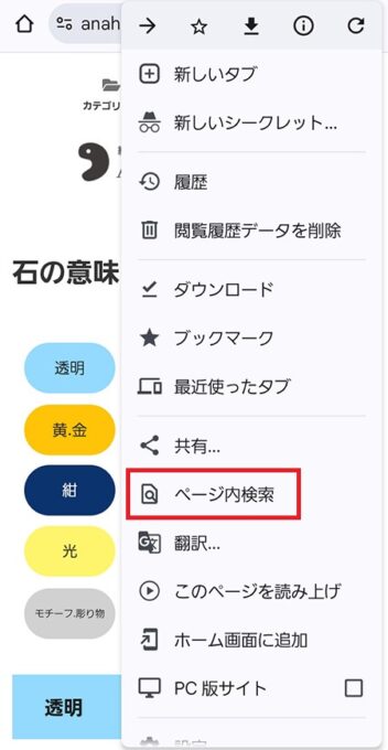 ②表示された画面にある「ページ内を検索」をタップ(下画像の□)