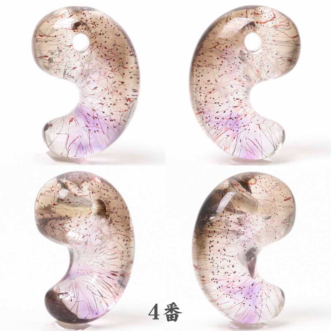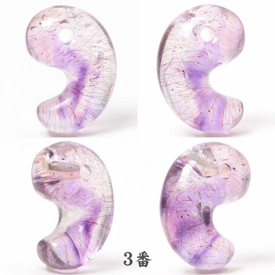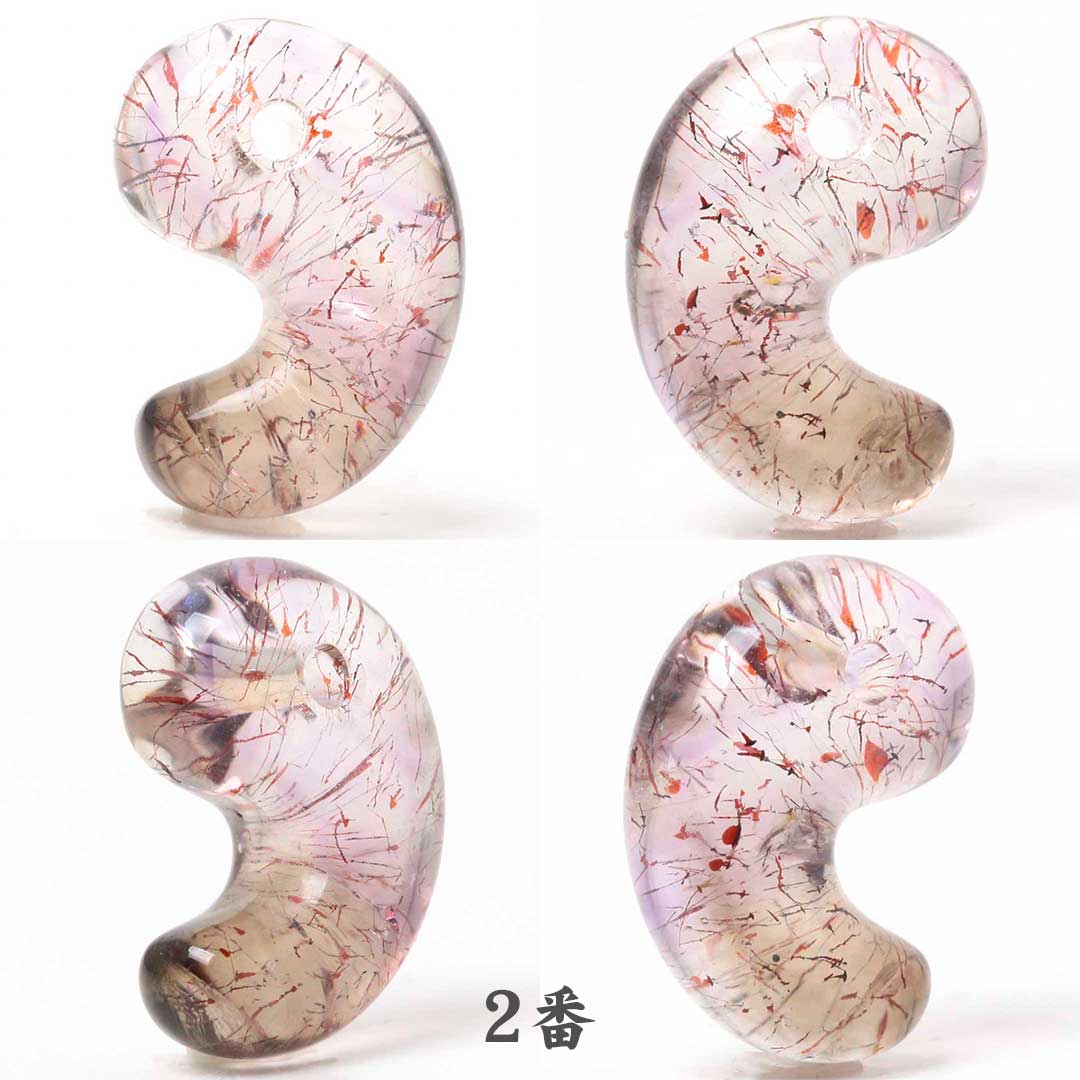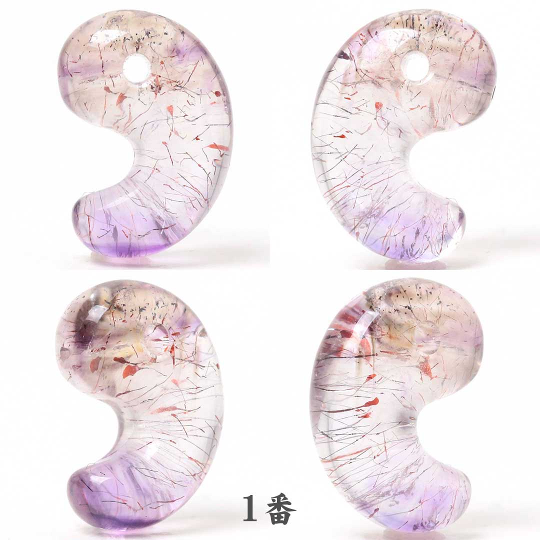 アメジストエレスチャルの結晶は成長する過程で生じる「結晶が重なり合う」「凹みが出来る」「結晶の内部に空洞が出来る」という特徴から通常のクラックのある水晶やアメジストとは違い、加工後の勾玉の表面にも凹みが生じてしまいます。