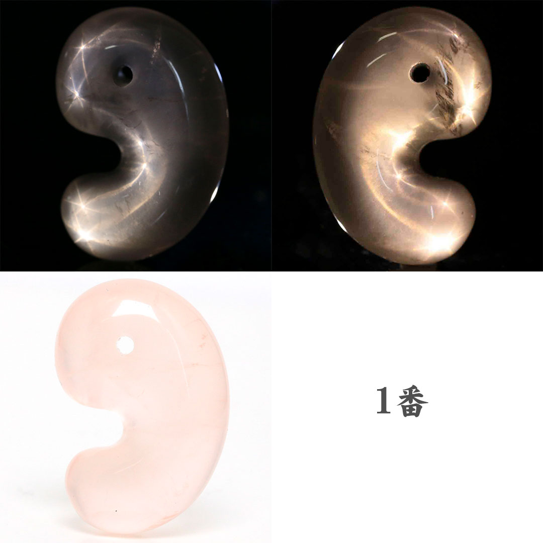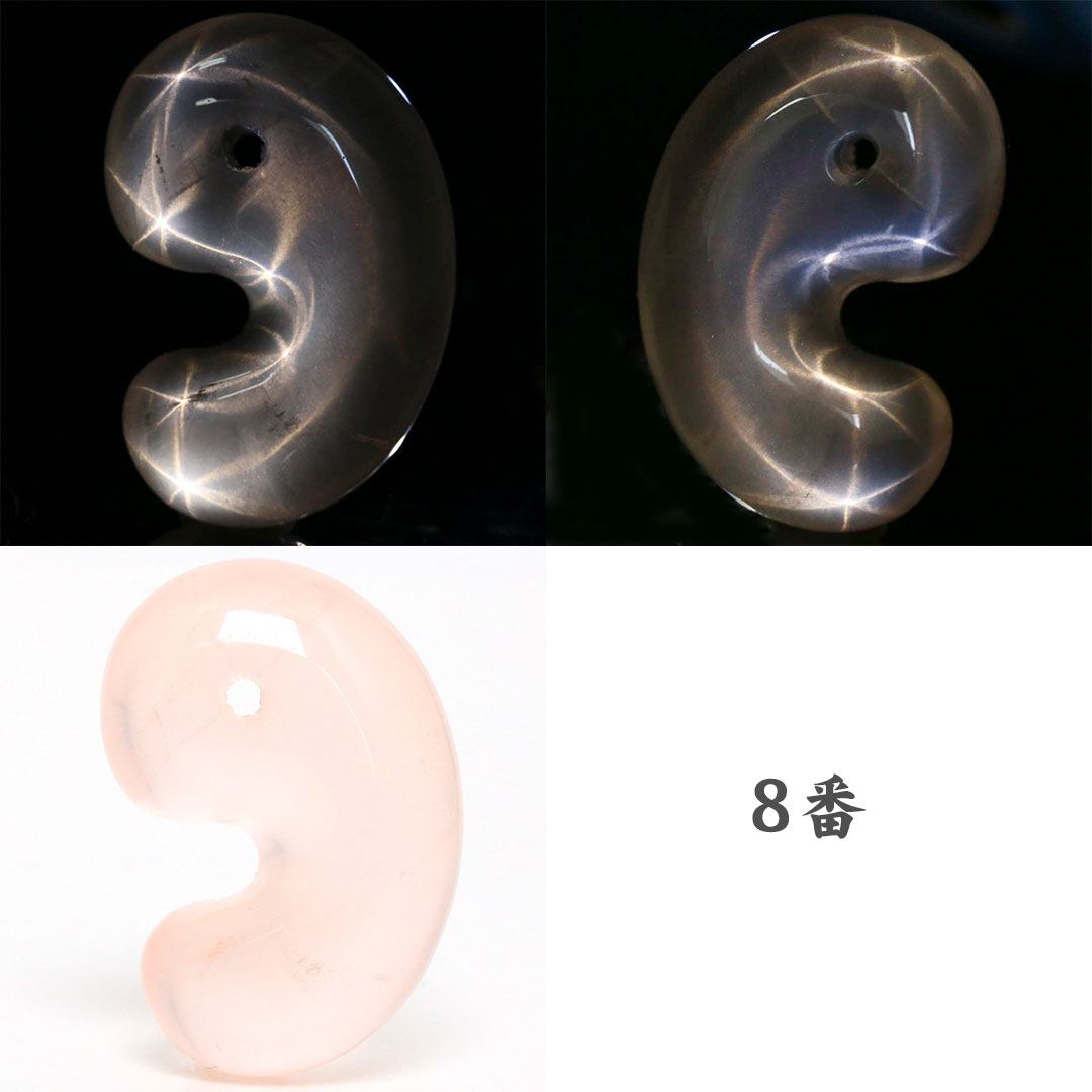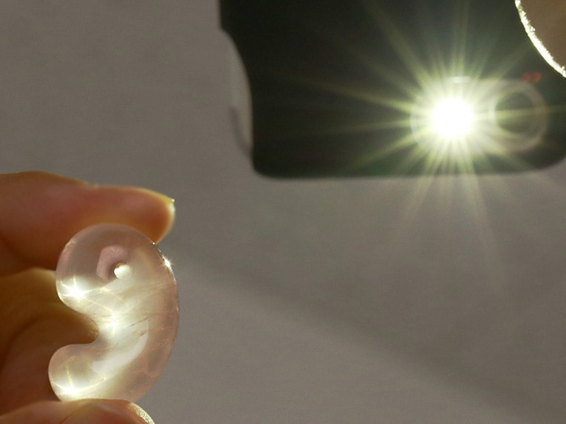 ②下の画像のようにライトは勾玉の後ろから当て、透かすように見てください。ライトの光から勾玉までの距離が近すぎるとスター効果を見ることは出来ませんので、約10cm程度離した距離で光を当ててください。