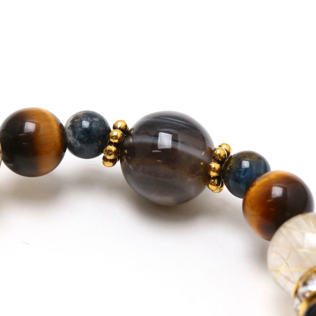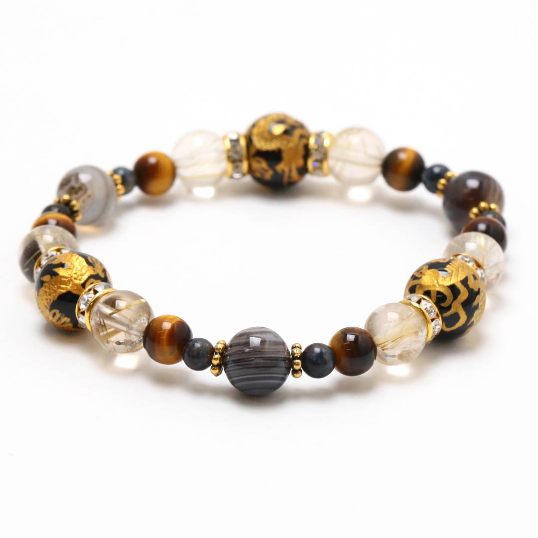 ▼使用されている石:オニキス / 天眼石 (アイアゲート) / ゴールデンルチルクォーツ / タイガーアイ / ピーターサイト / 龍