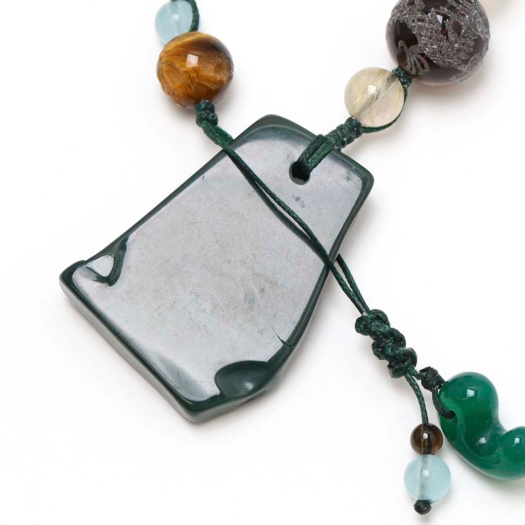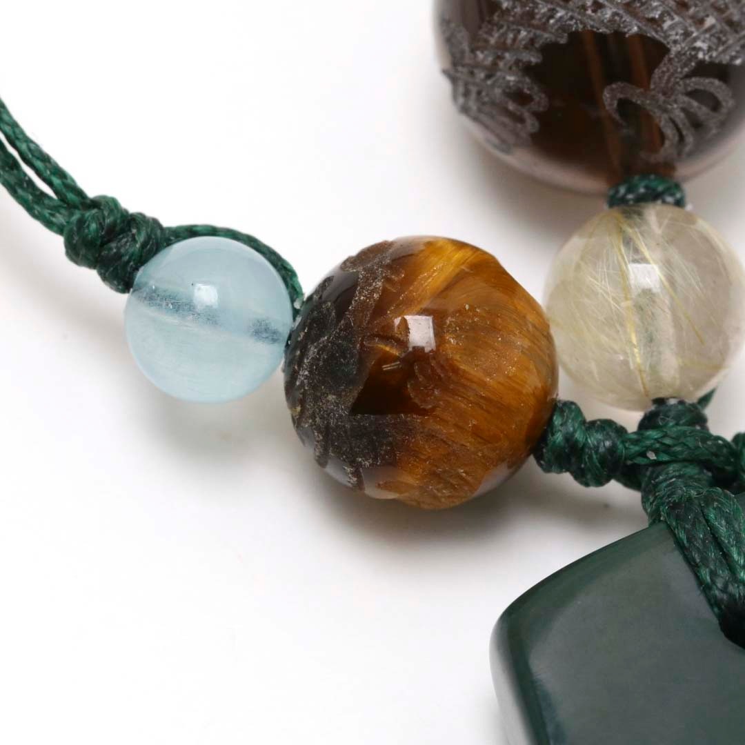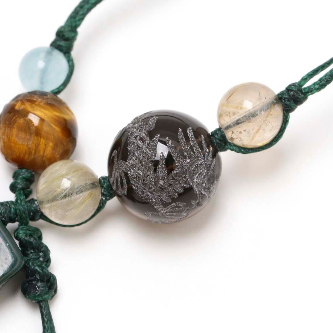 ▼使用されている石:出雲石 / スモーキークォーツ / ルチルクォーツ / タイガーアイ / アクアマリン / 青めのう(緑色) / 龍