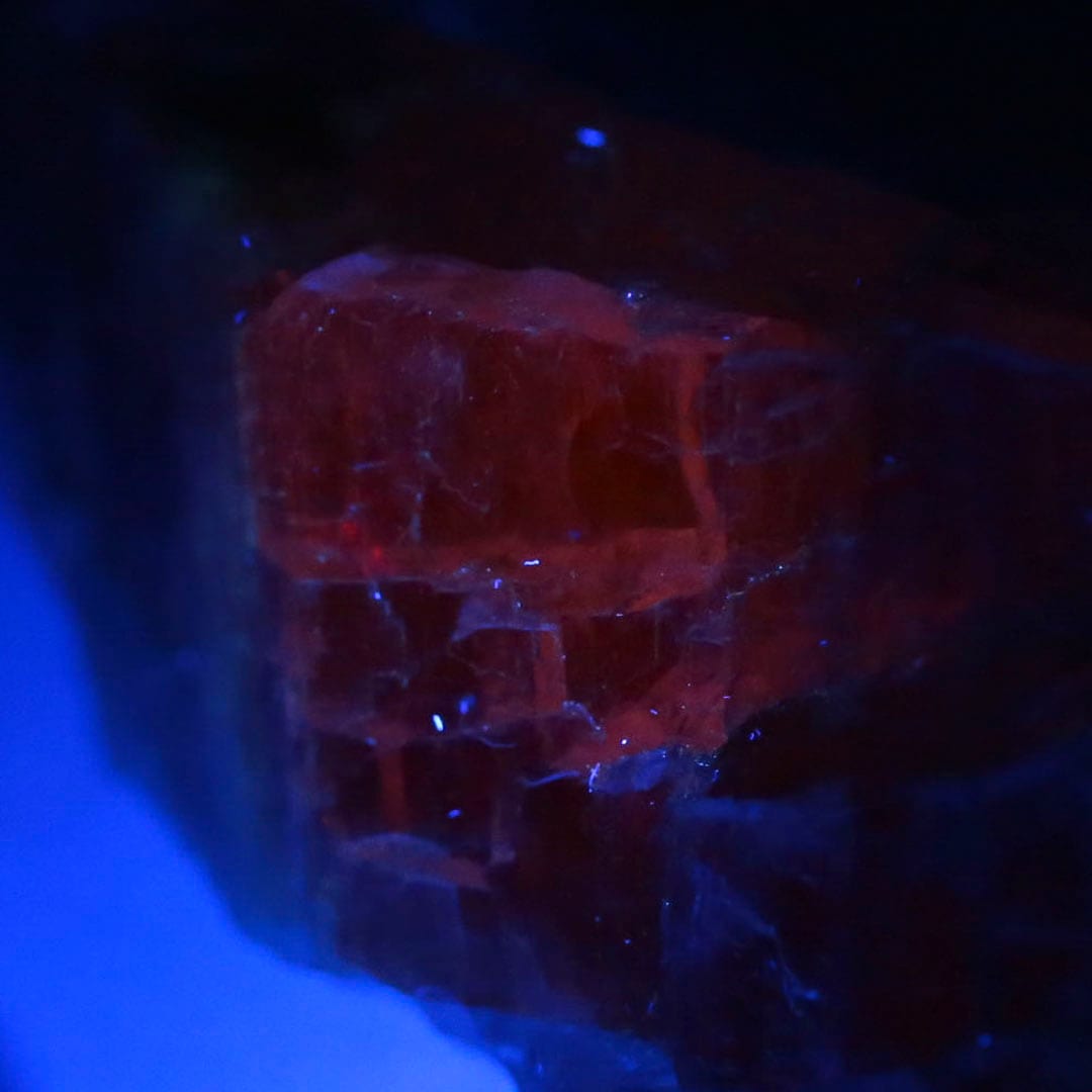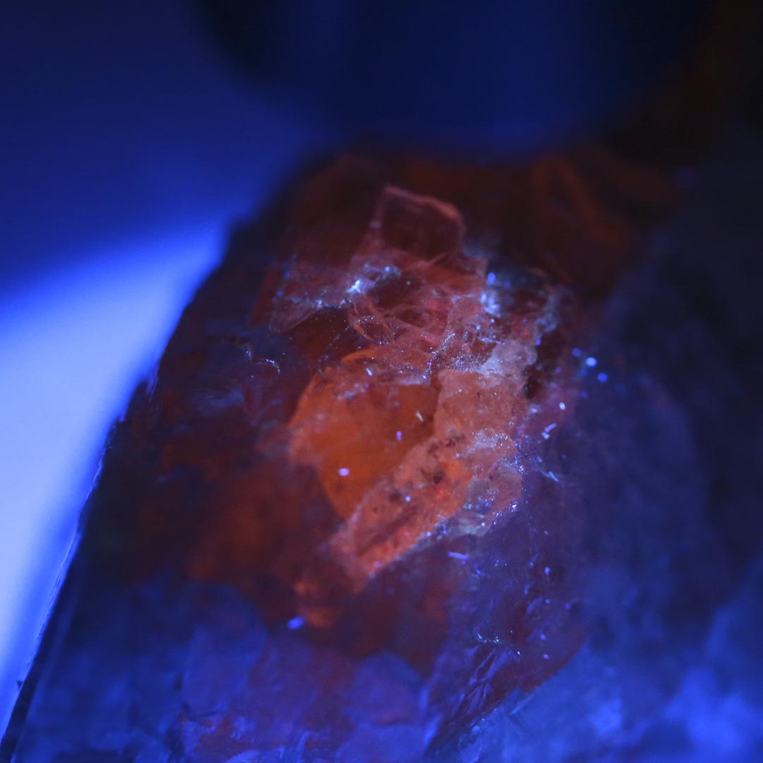 商品説明:蛍光性は弱いですが、暗くした状態でブラックライト(波長365nm)を当てることでオレンジ~赤色に蛍光します。