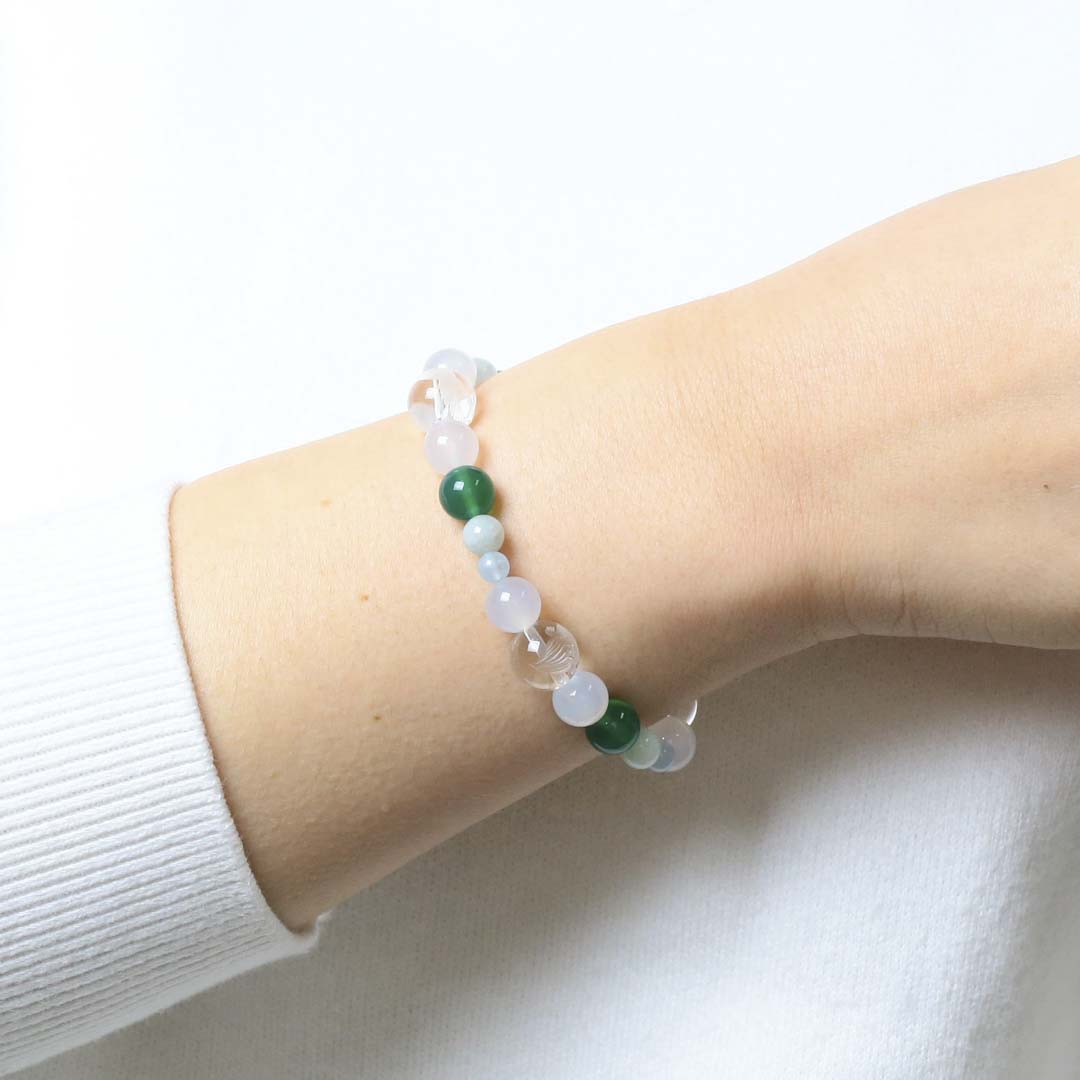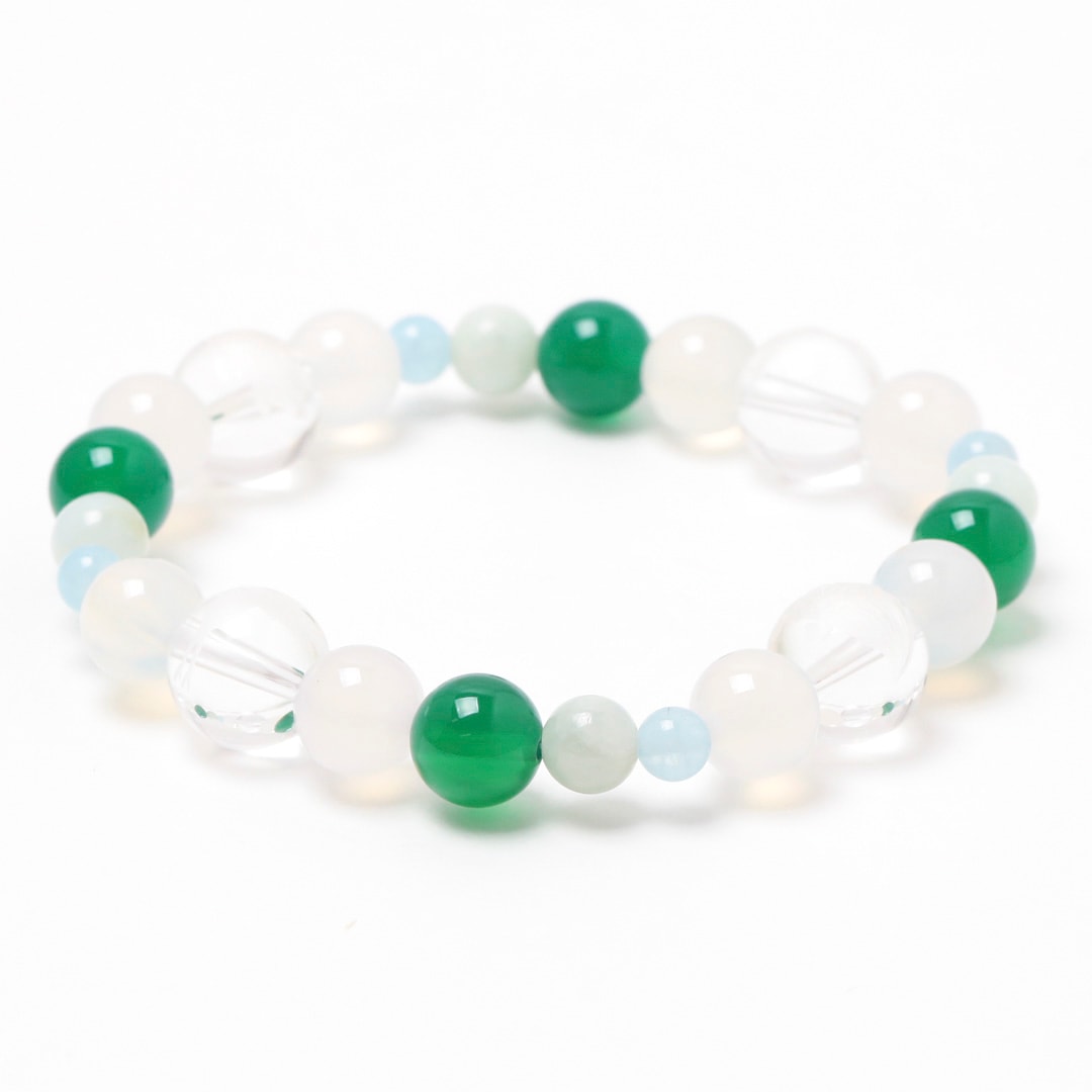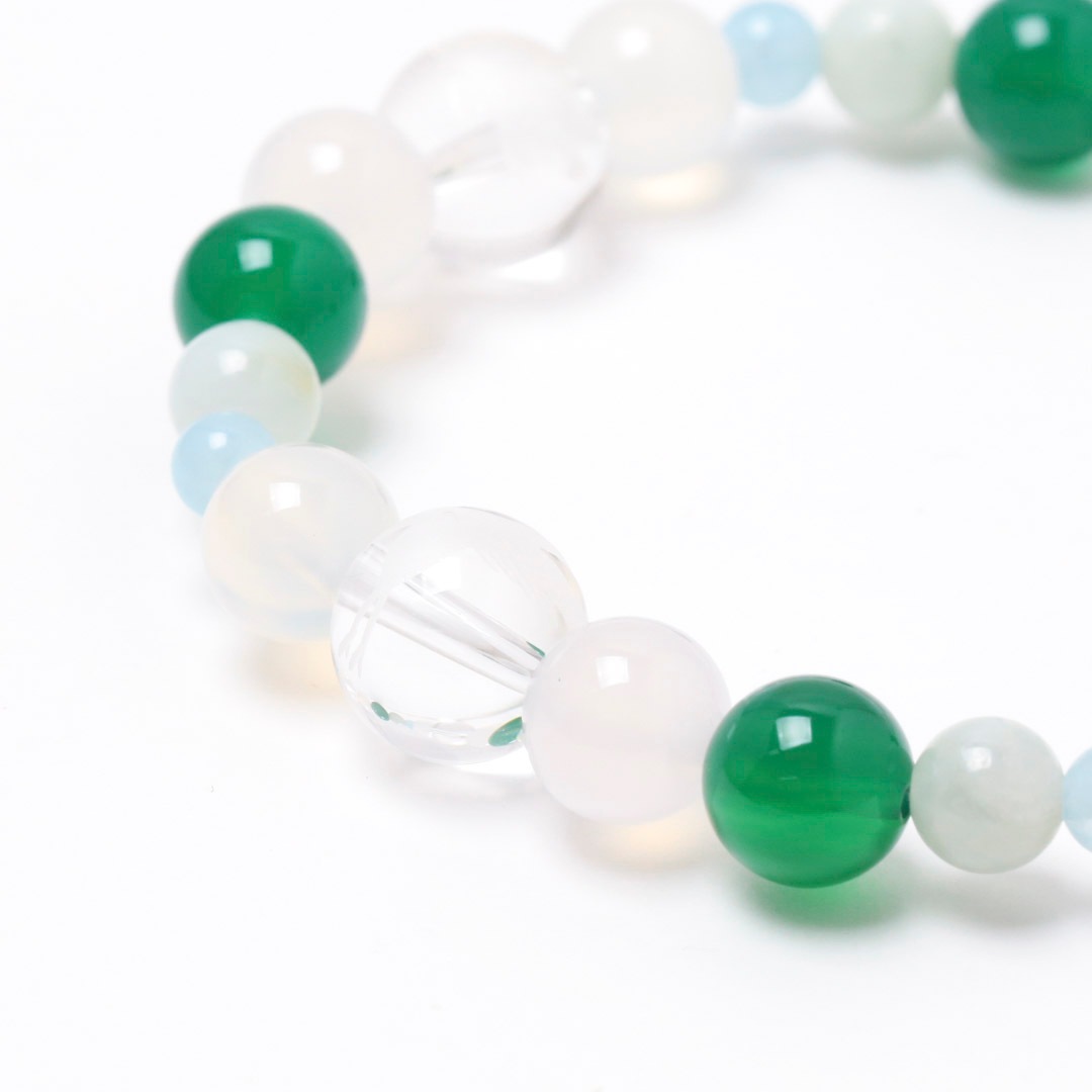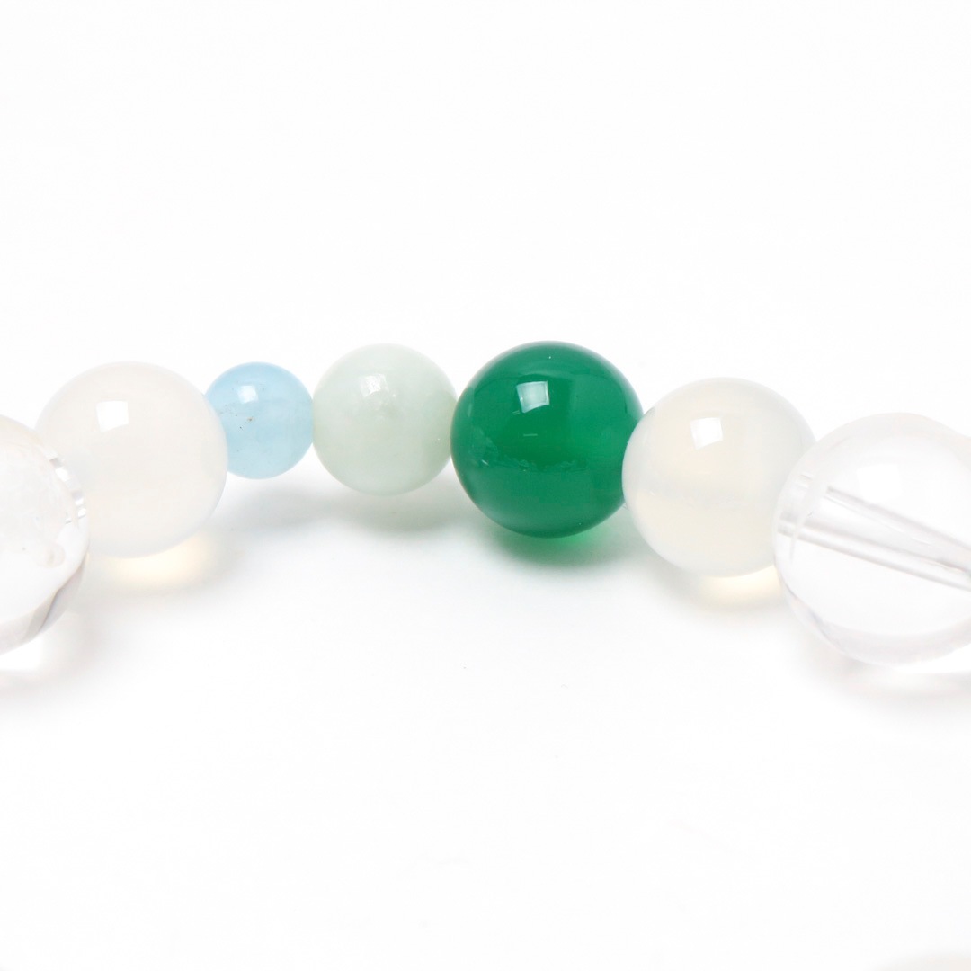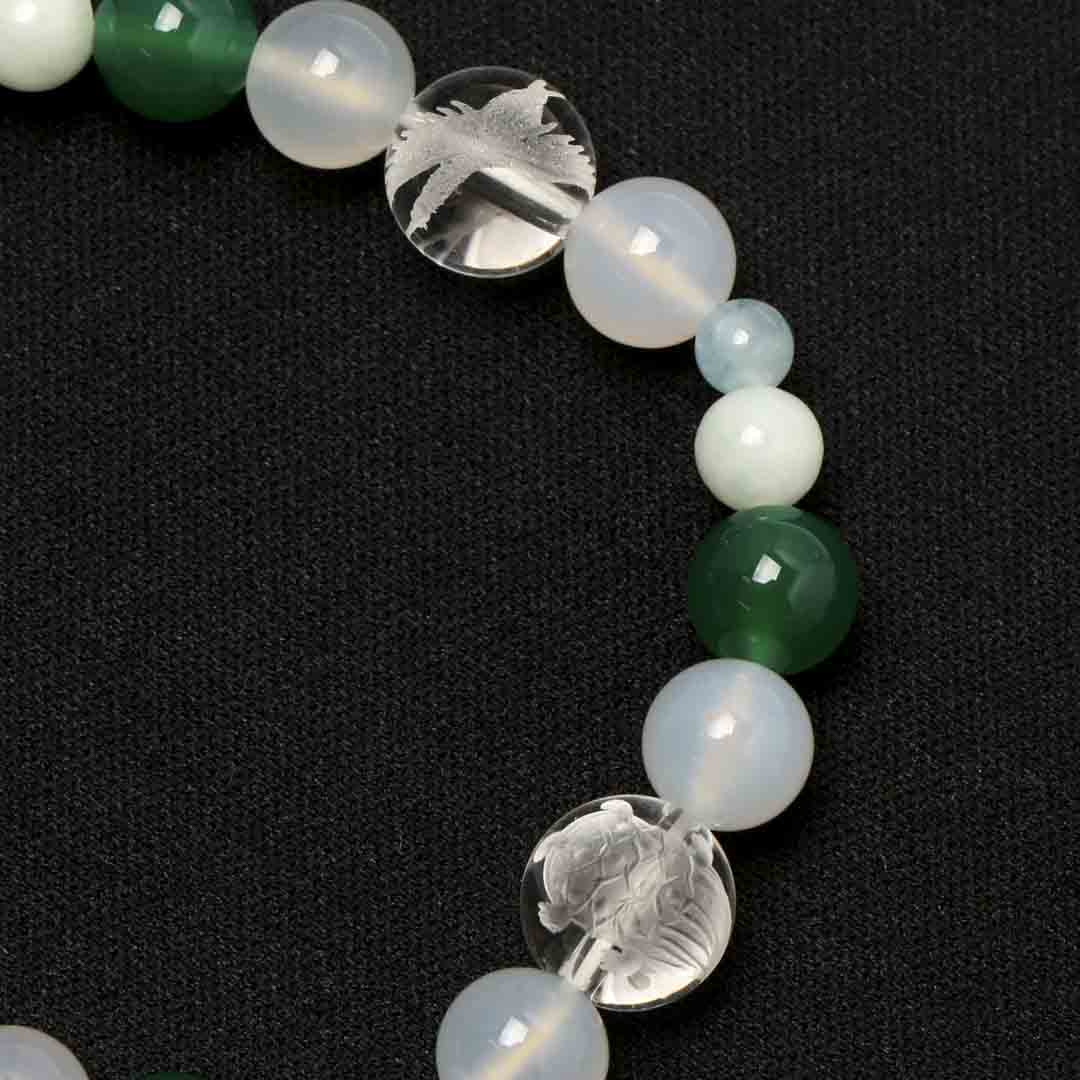 ▼使用されている石:水晶 / 白めのう / 青めのう(緑色) / ジェダイト (翡翠) / アクアマリン / 鶴 / 亀