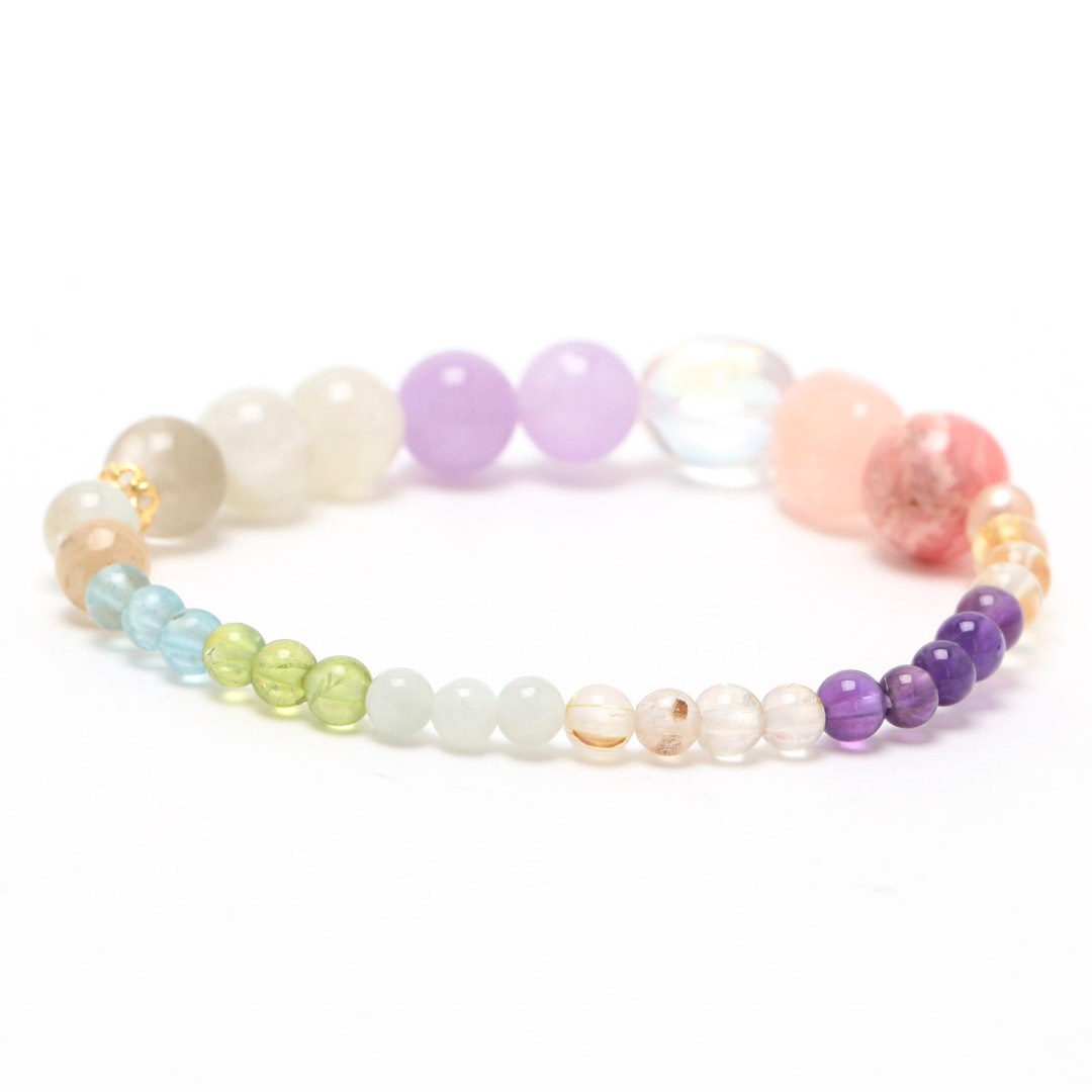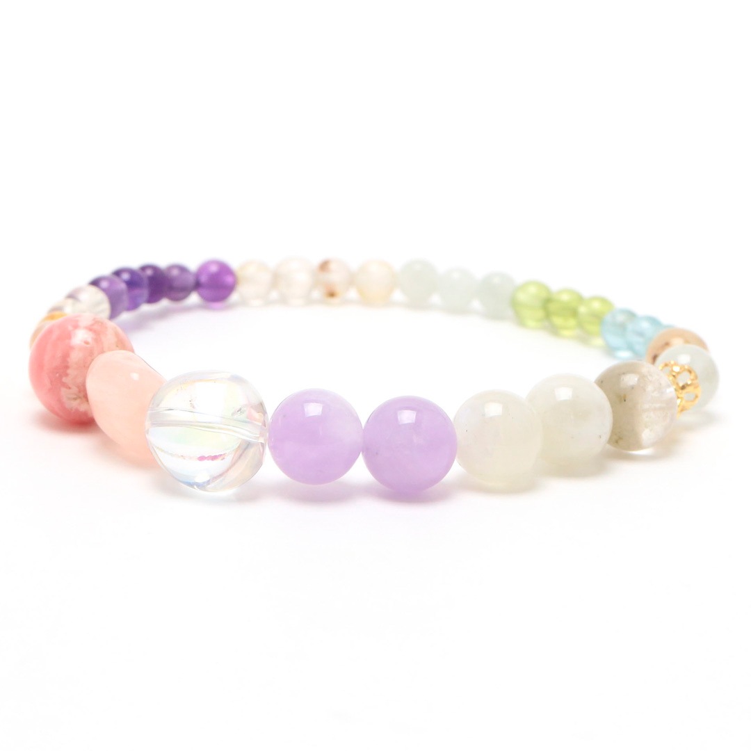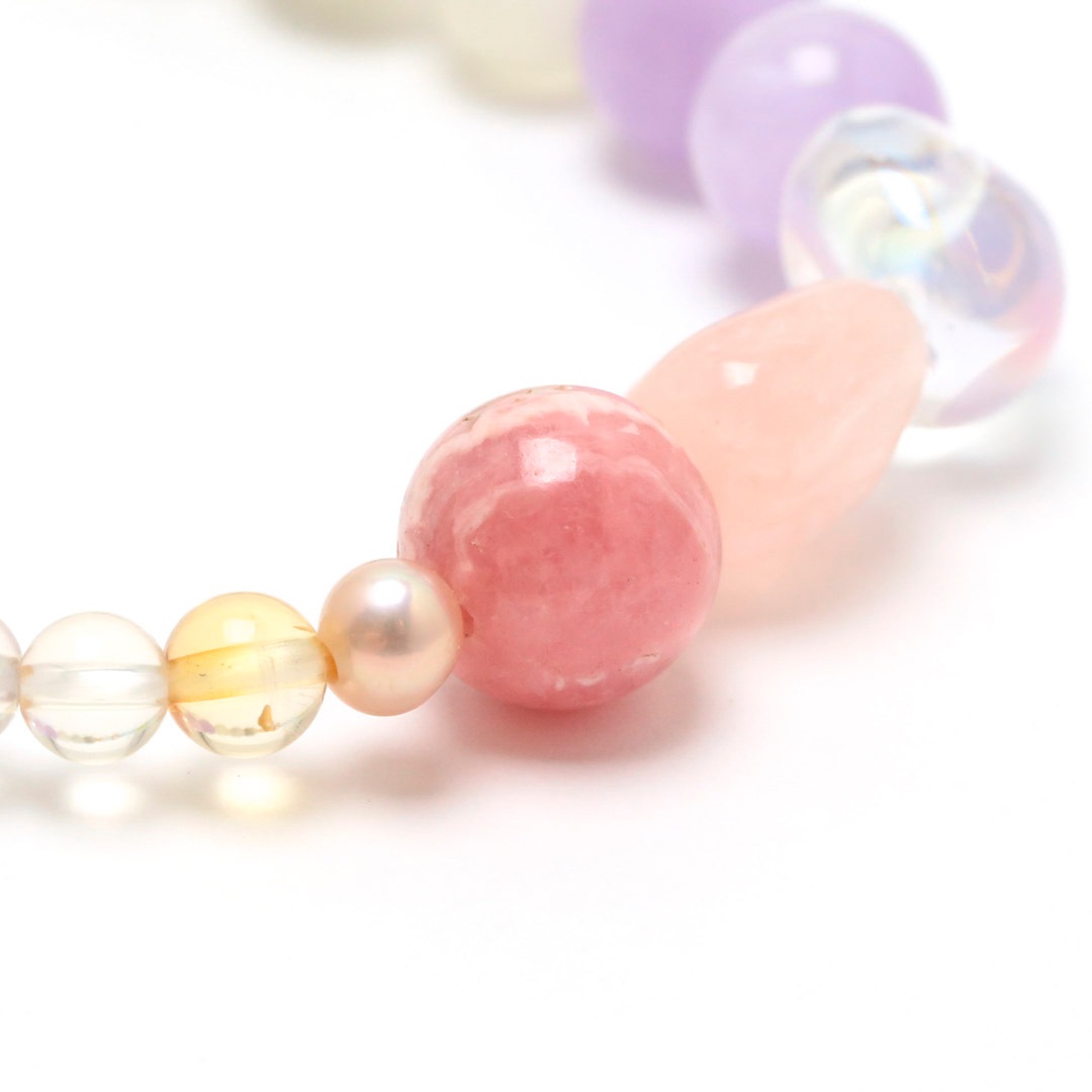▼使用されている石:ロードクロサイト / モルガナイト / オーロラクォーツ / ムーンストーン / ガーデンクォーツ / ミルキーラベンダーアメジスト / アクアマリン / ジェダイト (翡翠) / 淡水パール / ペリドット / アパタイト / アメジスト / ルチルクォーツ / シトリン