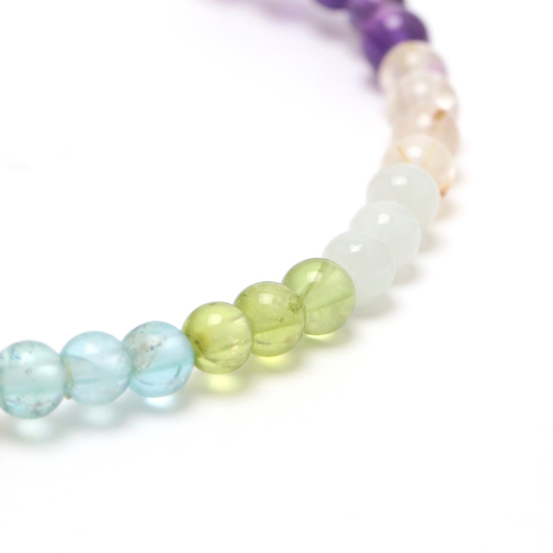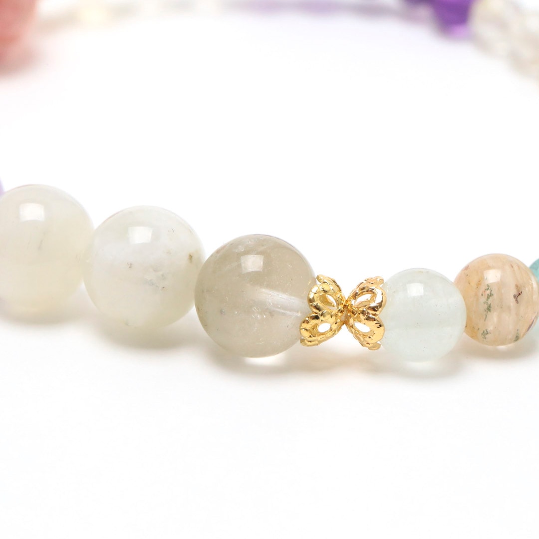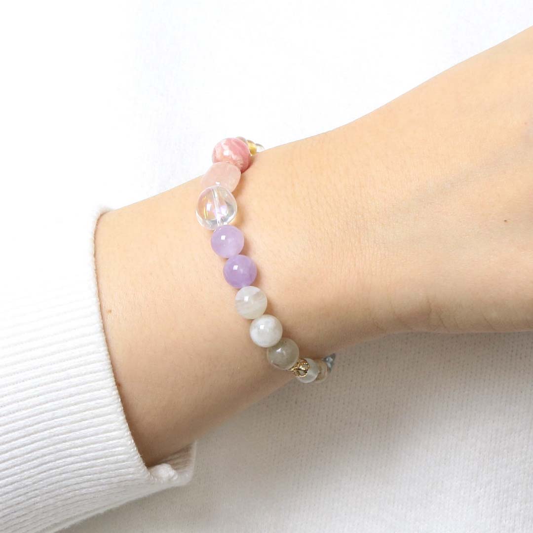 ▼使用されている石:ロードクロサイト / モルガナイト / オーロラクォーツ / ムーンストーン / ガーデンクォーツ / ミルキーラベンダーアメジスト / アクアマリン / ジェダイト (翡翠) / 淡水パール / ペリドット / アパタイト / アメジスト / ルチルクォーツ / シトリン